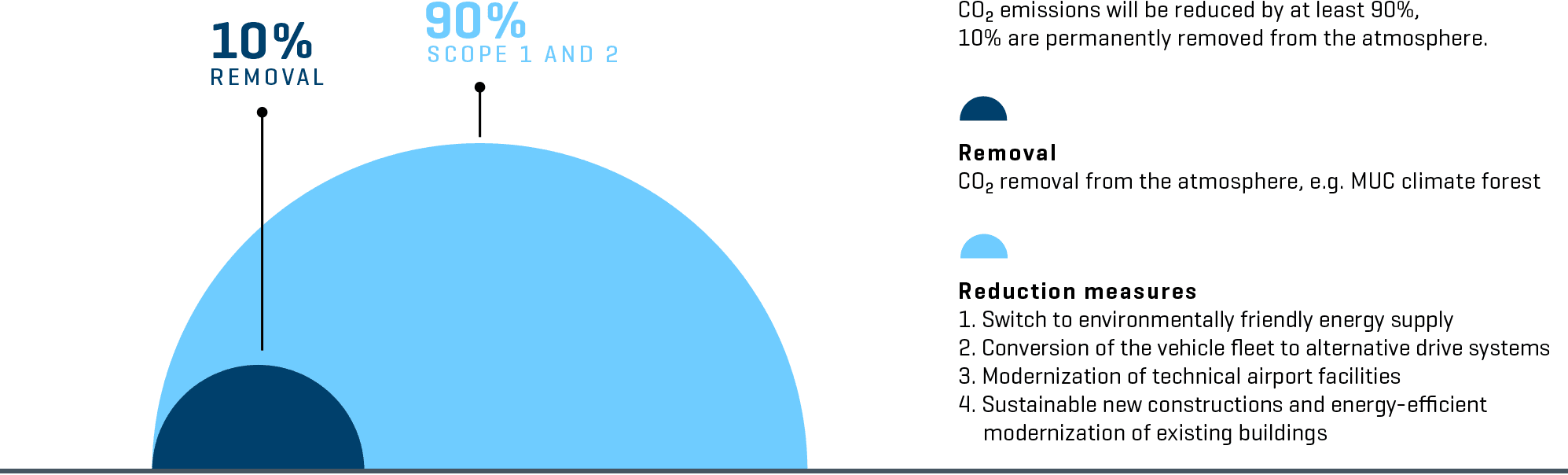 By 2035 at the latest, Munich Airport’s operations should no longer release CO₂ into the atmosphere. Net zero entails reducing the emissions that we can influence ourselves by at least 90 percent. The remaining maximum of ten percent will be actively and permanently removed from the atmosphere with suitable projects. The net zero target comprises four areas: