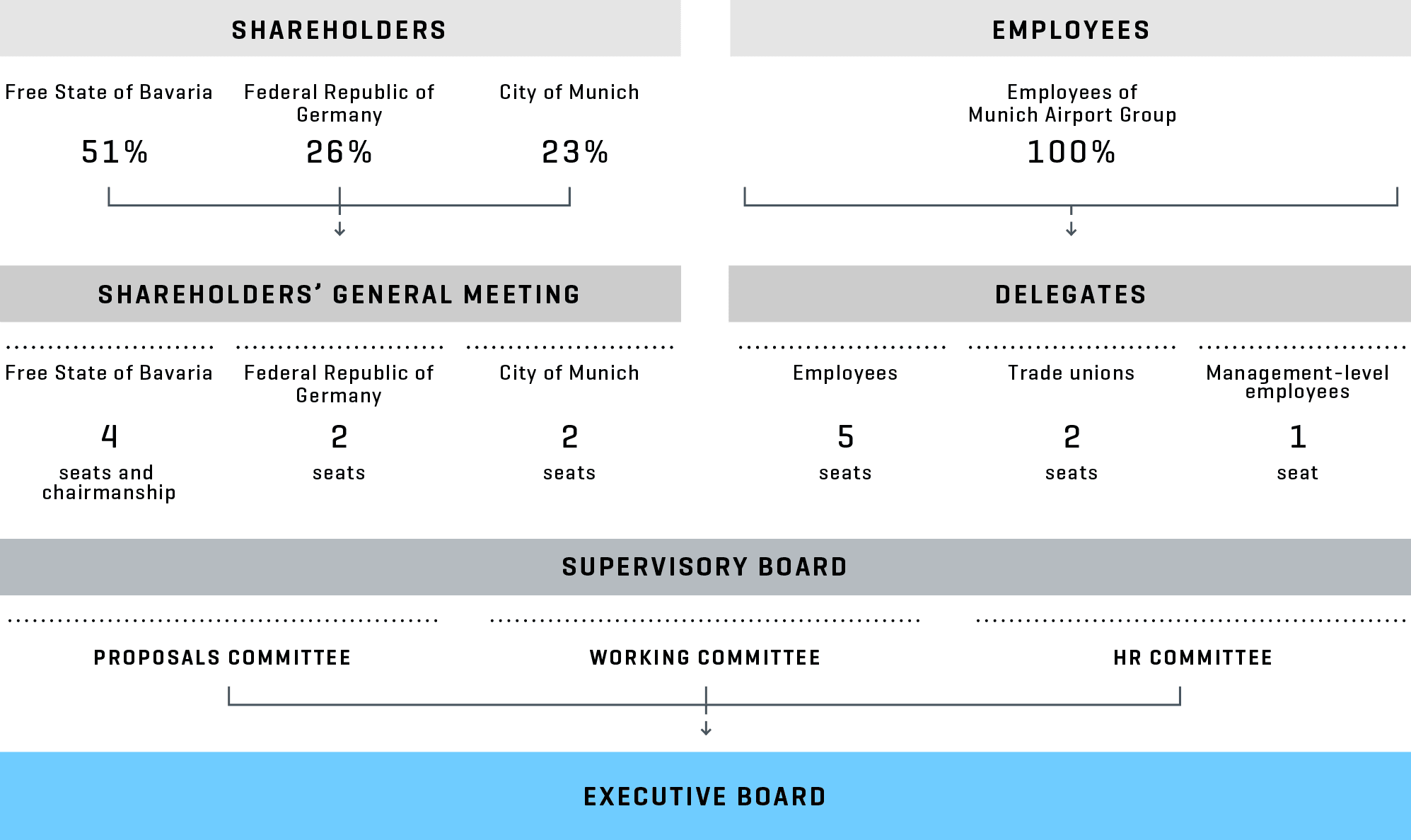 The Shareholders’ General Meeting is the highest monitoring and decision-making body. Central decisions on the business and economic fundamentals of the Group (including airport expansion and borrowing of loans) must be adopted unanimously.