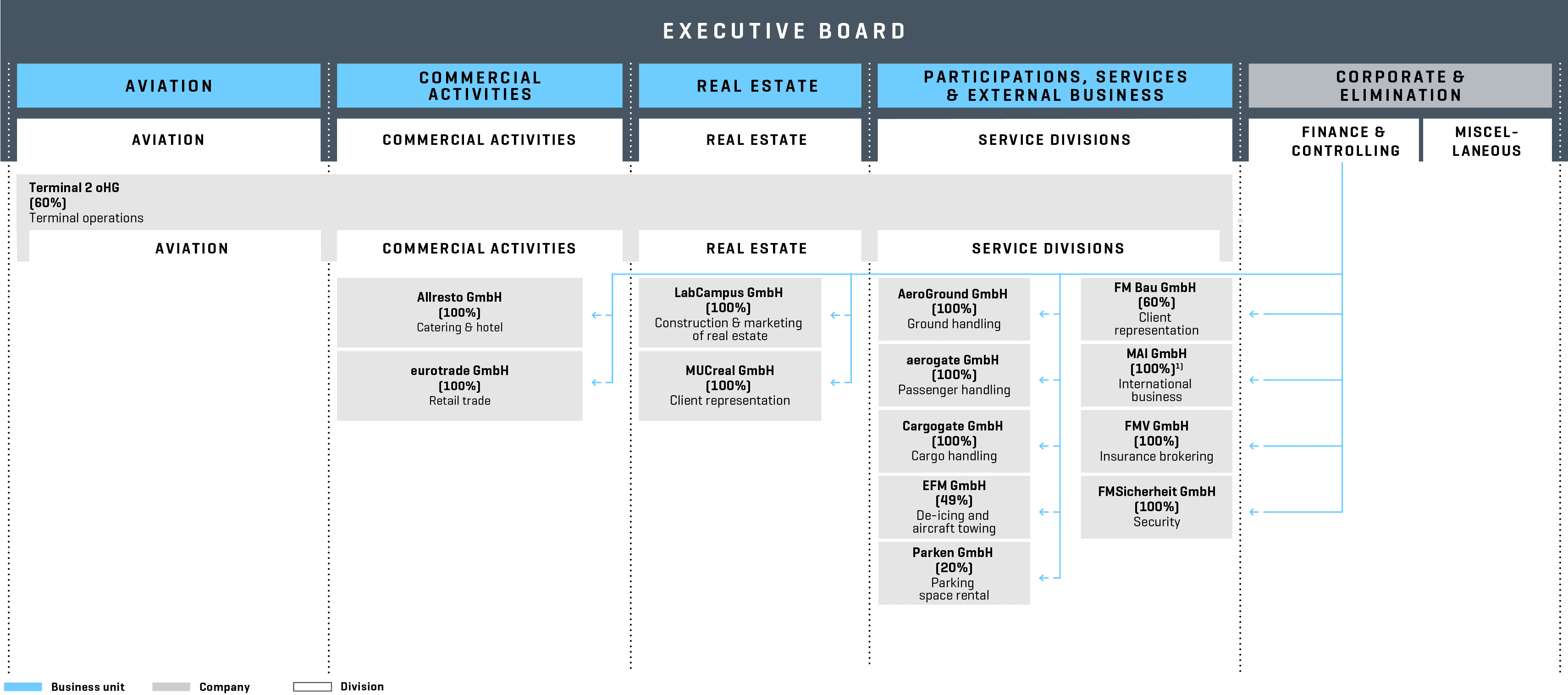 Munich Airport is active via the business units Aviation, Commercial Activities, Real Estate and Participations, Services & External Business. The service profile of the Group covers virtually all the services available on the airport campus – from flight operations to passenger and cargo handling through to retailing, hotels, and gastronomy. This integrated business model and depth of added value sets Munich Airport apart from its European competitors.