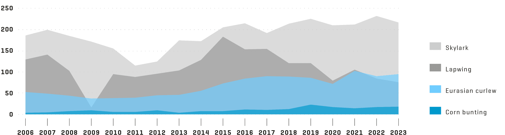 15 years ago, in August 2008, the areas of the «Nördliches Erdinger Moos» were designated as an EU bird sanctuary. In addition to the Eurasian curlew, lapwing, and grey wagtail, a total of 40 bird species, some of which are highly endangered, enjoy a high level of protection on and around the grounds of Munich Airport. The heart of the 4,525-hectare bird sanctuary is the approximately 666-hectare airport meadows around both the take-off and landing runways. In 2023, they were home to the most important meadow breeding area in Bavaria with 99 breeding pairs of curlew and 79 breeding territories of lapwing, the bird of the year in 2024. The endangered black-tailed godwit, of which there were 19 breeding pairs across Bavaria in 2021, has also repeatedly raised young birds on the airport meadows. Furthermore, in conjunction with the compensatory and replacement areas outside the airport premises, the airport serves as a refuge for rare plant species such as the creeping celery, reptiles such as the sand lizard, and insects such as the bird’s-eye damselfly.
