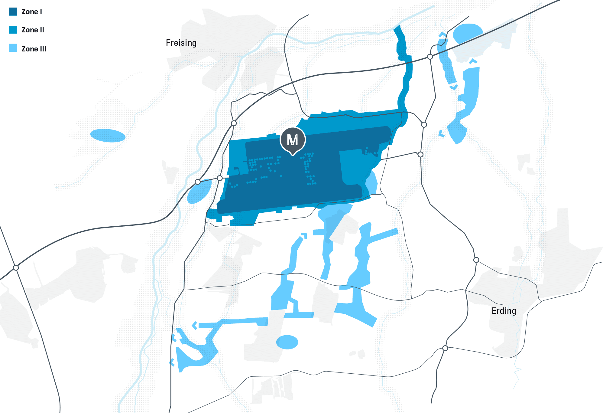 To integrate Munich Airport into its environment in the best possible way, FMG created structures from the very outset that would ecologically upgrade the extensive surrounding area in the Erdinger and Freisinger Moos and link it together. For this purpose, a three-zone concept was implemented within the framework of the current green regulations: Zone I comprises the airport premises with runway system, buildings and roads, Zone II the wooded and structurally rich green belt around the airport premises and Zone III the ecological compensation measures.